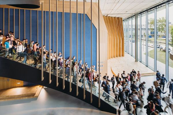 根據UNStudio的說法,“面向未來”的校園是活躍的。也就是說,該建筑不僅尋求與周圍的公共空間建立聯系,而且通過其透明的底層,變成了一個有蓋的公共廣場,使無形的學習世界成為可見的、有吸引力的體驗。