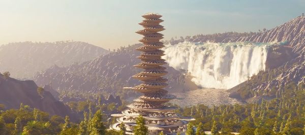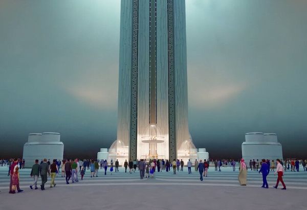 在這個(gè)未來主義大都市的中心,坐落著地標(biāo)性建筑,一座足以容納20座帝國(guó)大廈的立方體摩天大樓,作為王國(guó)雄心的標(biāo)志聳立在城市的上空。這座大樓給人留下深刻印象,又錯(cuò)綜復(fù)雜,它被精雕細(xì)琢的幾何圖案所籠罩,象征著王國(guó)的伊斯蘭歷史,并讓人聯(lián)想起400米高的天際線上的建筑。