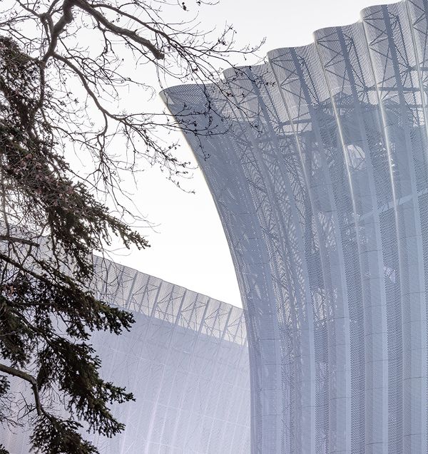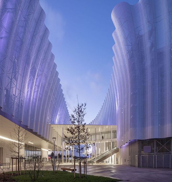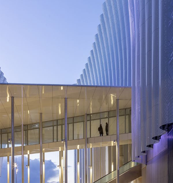 建筑師Ferrier Marchetti Studio設計的CO'Met Arena擴大了其起伏的表皮結構,使結構更加輕盈和流暢。作為大型功能體量的對立面,外墻塑造了一個流動和柔軟的建筑,并延伸到所有的設施,覆蓋了會議、展覽和體育中心的外表面。金屬板形成了統一的圖案,并以曲線的變化作為點綴,使微妙的光線通過穿孔的平面進入。輕質的半透明表皮采用了天空和周圍輪廓和風景的顏色。建筑物的入口是通過一個連接設施體量的大型露天雨棚實現的。該項目是一個雄心勃勃的可持續發展方法的一部分,因為它擁有法國最高效的體育項目的能源消耗。體積完全由地熱能源處理,而建筑顯示出極大的節儉,重點是輕質外墻的設計,避免使用過多的材料。