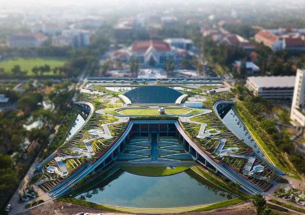 部分“地面感受”側(cè)重于將環(huán)境作為設(shè)計解決方案,將材料、工藝和構(gòu)造融為一體,創(chuàng)造出多維空間感。例如,Arsomsilp社區(qū)與環(huán)境建筑師事務(wù)所設(shè)計的Puey Ungphakorn百年紀(jì)念大廳(2019年)和Tha Chalom天空之舟圖書館(2022年),它們形成了和諧的微生態(tài)系統(tǒng),激活了原有的環(huán)境界面。Ambi工作室的湖山水庫考古展覽館(2023年)和毓秀美術(shù)館(2015年)順應(yīng)地形,通過精心打造的空間為游客提供獨特的觀賞體驗。