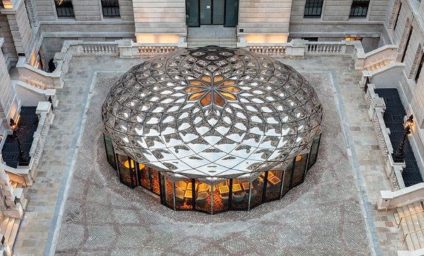 最后,溫斯頓-丘吉爾(Winston Churchill)和T.E Lawrence(又名阿拉伯的勞倫斯)每天上班時曾經走過的庭院鵝卵石被精心保留下來,并重新鋪設成現代圖案,與咖啡吧閃閃發光的花瓣式屋頂相呼應。荷蘭的Octatube公司與建筑公司合作設計了展館結構,并與總部位于倫敦的奧雅納公司共同提供了工程、聲學、照明和可持續發展方面的專業知識。