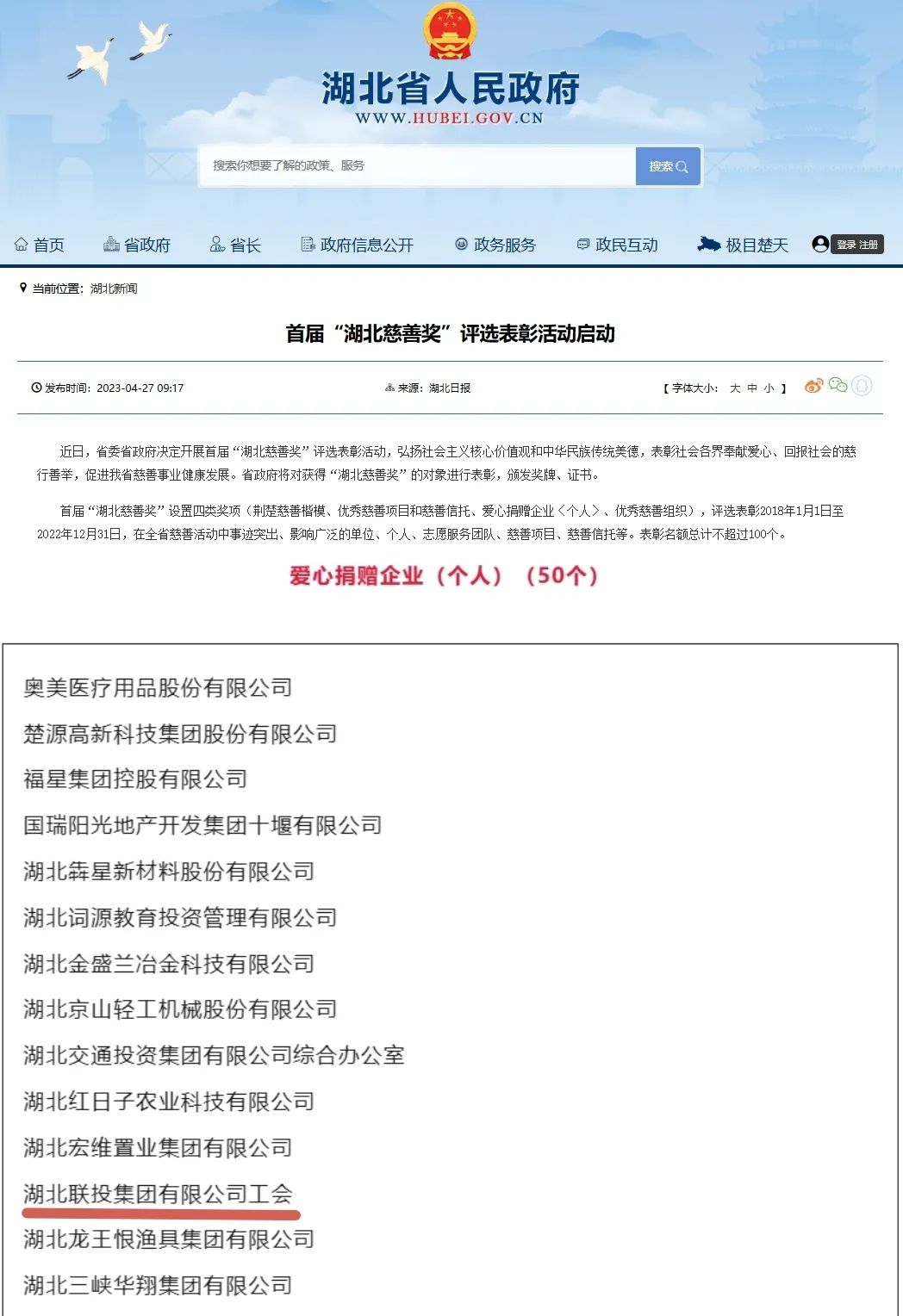 喜報!湖北聯(lián)投集團榮獲首屆“湖北慈善獎”